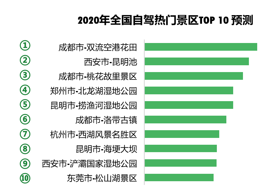 清明期間哪些景區最熱門?從自駕出行方面來看,市民更熱衷于公園、湖邊等戶外區域,熱門景區Top10中,成都占3席,西安、昆明各占2席,其中,成都雙流空港花田排名第一,其次是西安的昆明池,成都桃花故里景區排名第三。