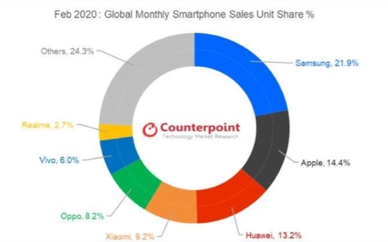 速途網訊 今日,據市調機構Counterpoint正式公布《2020年2月全球智能手機市場監測報告》的數據顯示,三星、蘋果、華為是全球智能手機市場份額前三甲,對應的市場份額分別為21.9%、14.4%、13.2%。另外,realme真我智能手機位于第七,市場份額為2.7%。