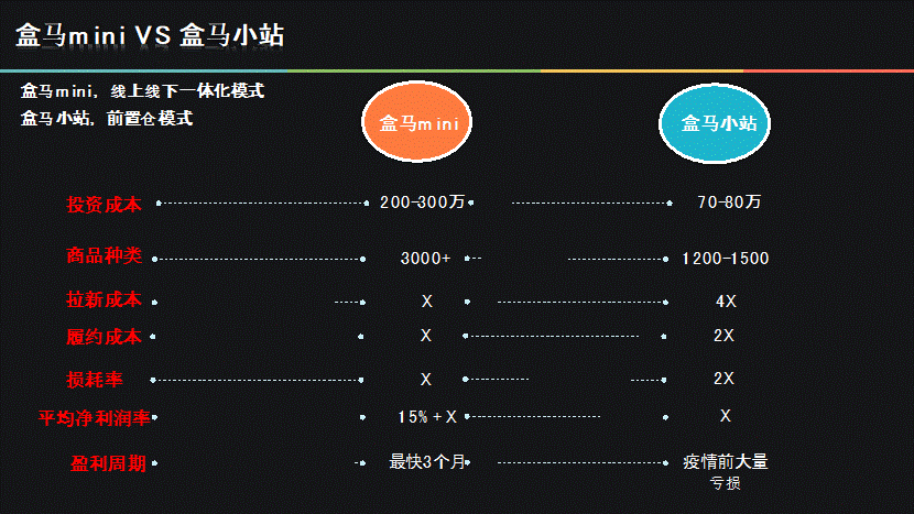 招商零售研報顯示,由于多了線下門店體驗,盒馬mini的次月留存率是小站的一倍,履約成本也小一半;由于mini門店新客大部分來自于門店轉化,人均拉新成本是小站的1/4;門店促清的效果大于純線上,盒馬mini的損耗率也比小站低了近一倍,因為損耗低,所以商品品類也幾乎是后者的一倍。綜上所述,盒馬mini的平均每單的凈利潤率要比小站高15%,前者最快3個月就能盈利,而盒馬小站在疫情之前基本上是虧損狀態。