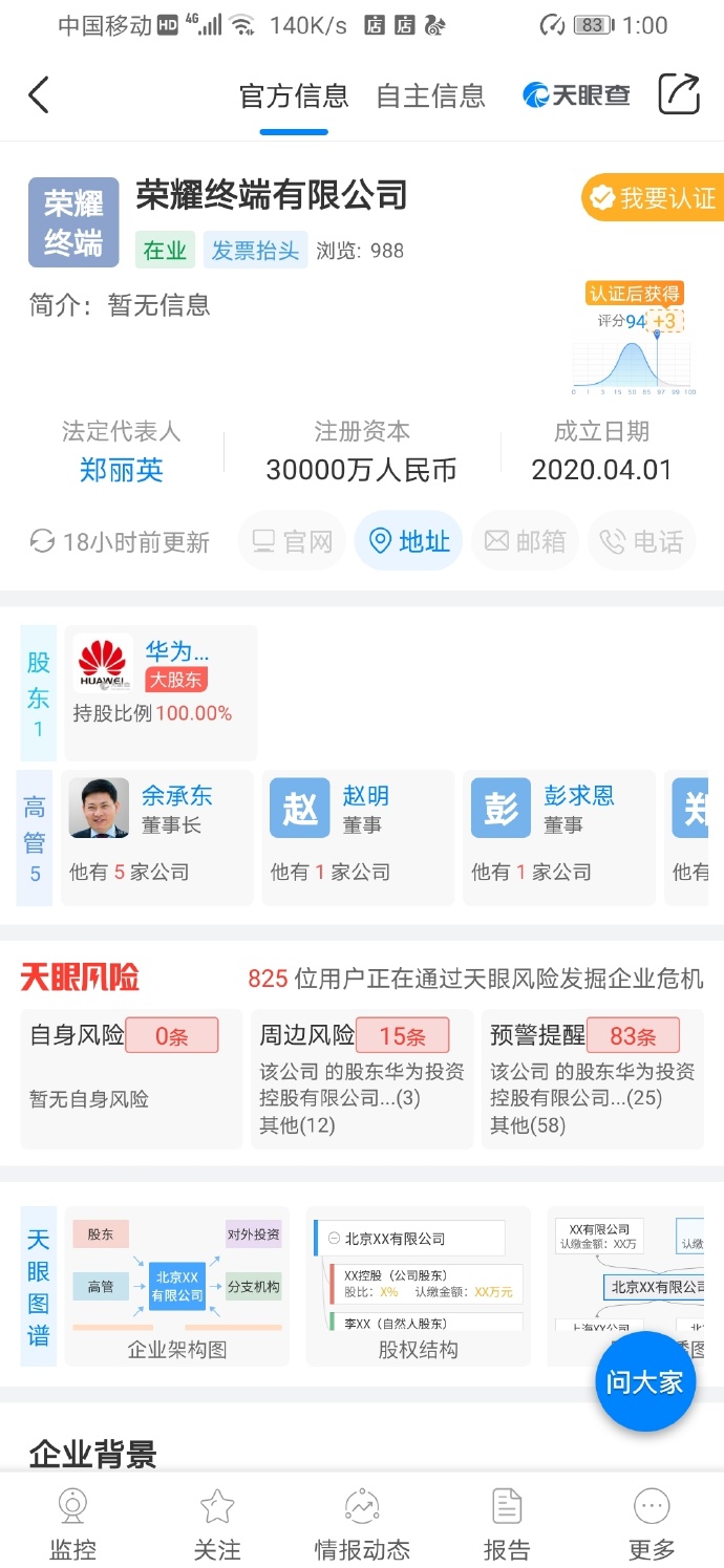 華為成立榮耀終端公司 仙雯 ? 2020年4月2日 13:40 ? 5G, 快訊, 手機 速途網(wǎng)訊 天眼查顯示,4月1日,榮耀終端有限公司成立,注冊資本3億人民幣,法定代表人鄭麗英。華為消費者業(yè)務CEO余承東擔任榮耀終端有限公司董事長一職。 ?趙明任董事 ????。 榮耀 贊 (0) 仙雯 0 生成海報 AI保險科技平臺“保險查查”獲1000萬元天使輪融資 上一篇 2020年4月2日 13:29 日本女孩演唱中國抗疫歌曲傳遞正能量 短音樂給年輕人更多想象 下一篇 2020年4月2日 13:43
