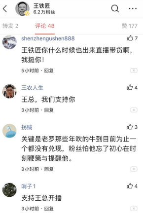 評論之中,不乏有網(wǎng)友喊話王欣出來直播帶貨,并表示自己一定會力挺他。