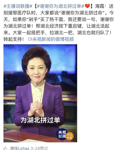 關(guān)鍵時(shí)刻,央視送來了“臨門一腳”。3月27日,央視《新聞聯(lián)播》主播海霞在節(jié)目中喊話,感謝大家“為湖北拼單”,“湖北人需要走出去,湖北的農(nóng)產(chǎn)品需要賣出去,只有這樣,湖北的經(jīng)濟(jì)才能活起來”,“前些天送別援鄂醫(yī)療隊(duì)時(shí),大家都說謝謝你為湖北拼過命。今天如果你剁手買了熱干面,我還要說一句,謝謝你為湖北拼過單”。