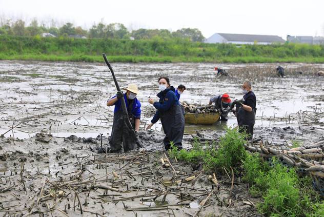 ▲央視新聞湖北洪湖藕產(chǎn)區(qū)的直播吸引了超過2000萬人次網(wǎng)友觀看,圖為央視新聞主播和藕農(nóng)共同下塘作業(yè)