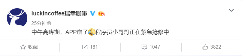 App崩潰?瑞幸咖啡回應:正在緊急搶修中 仙雯 ? 2020年4月3日 14:07 ? 快訊, 新餐飲 速途網訊 今天中午,有網友稱瑞幸咖啡App出現故障,無法下單,對此瑞幸咖啡回應稱,中午為高峰期,目前正在緊急搶修中。 贊 (0) 仙雯 0 生成海報 留學生小紅書曬使領館的“健康包”:這份恩情永記心間 上一篇 2020年4月3日 13:47 鯨鳴推出星動計劃 為新生代音樂人提供玩音樂新空間 下一篇 2020年4月3日 14:33