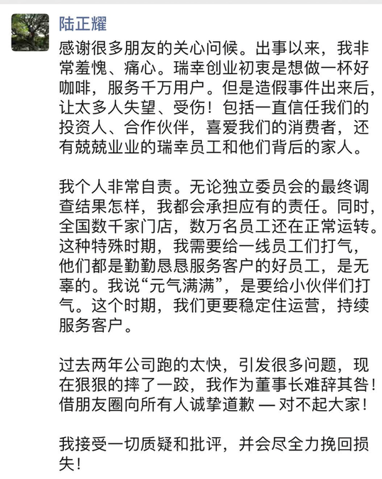 速途網(wǎng)訊 今日,瑞幸咖啡董事長(zhǎng)陸正耀在微信朋友圈表示,接受一切質(zhì)疑與批評(píng),盡全力挽回?fù)p失。無(wú)論獨(dú)立委員會(huì)的最終調(diào)查結(jié)果怎樣,都會(huì)承擔(dān)應(yīng)有的責(zé)任。同時(shí),他表示,過(guò)去兩年公司跑的太快,引發(fā)很多問(wèn)題,現(xiàn)在狠狠的摔了一跤,作為董事長(zhǎng)難辭其咎。