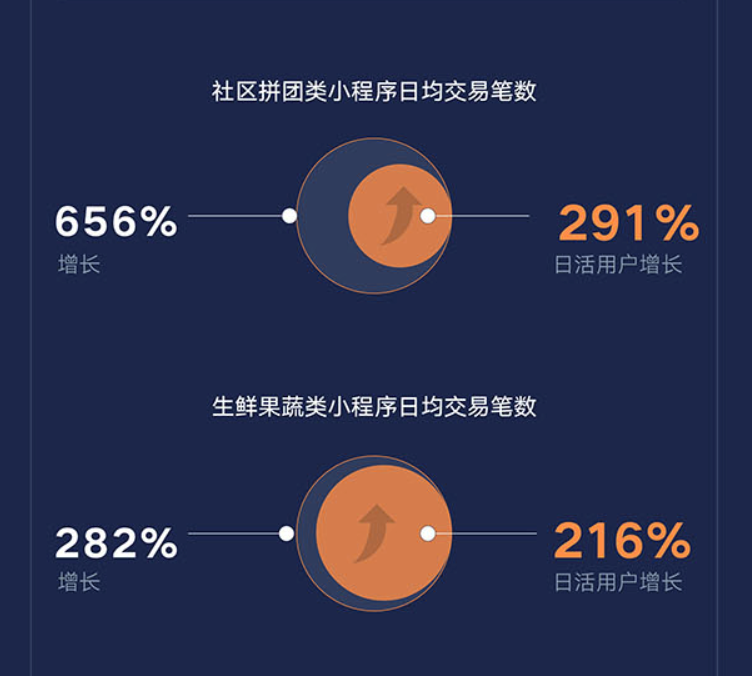 報告顯示,疫情期間社區拼團類小程序日均增長656%,生鮮果蔬類小程序日均交易筆數增長282%,日活用戶增長均保持200%以上。根據中國連鎖經營協會對71家頭部連鎖餐飲集團的企業調研數據,疫情期間發力外賣的餐飲企業數量占比高達91.6%,50%的企業擁有自己的外賣小程序,小程序點餐3月同比2月增長322%,小程序外賣增長402%。
