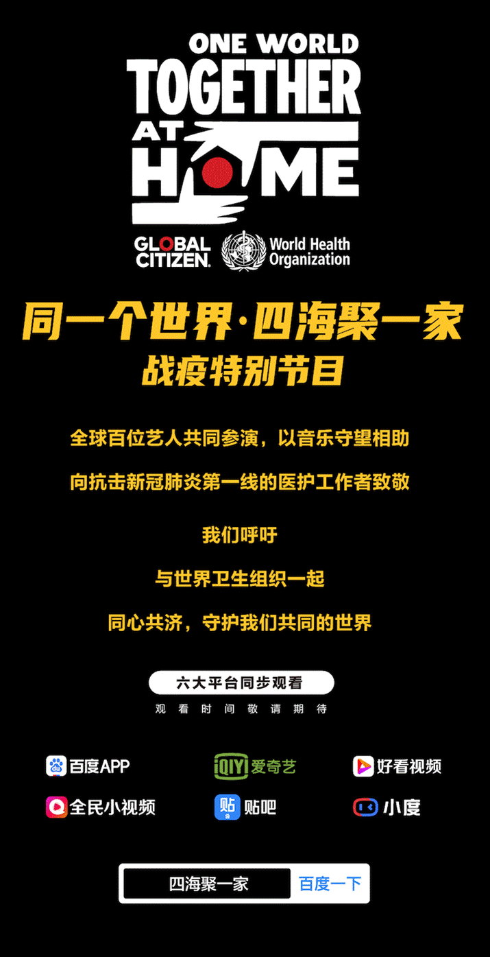 據(jù)了解,本次活動由世界衛(wèi)生組織聯(lián)合公益組織“全球公民(Global Citizen)”共同舉辦,時長8小時,意在鼓舞全球公民眾志成城對抗疫情,并向前線救死扶傷的醫(yī)護工作者們表達敬意。