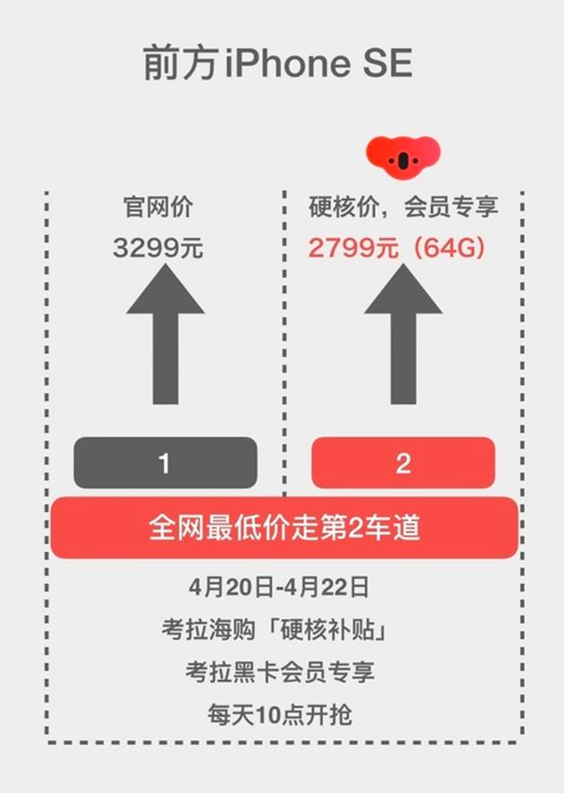 據(jù)了解,考拉海購本次新iPhone SE的硬核價(jià)格,只對黑卡會員開放。目前,考拉海購App首頁“硬核補(bǔ)貼”欄目已經(jīng)上線搶購預(yù)告,4月20日上午10時(shí)將通過預(yù)約方式開搶,專享活動將持續(xù)3天。