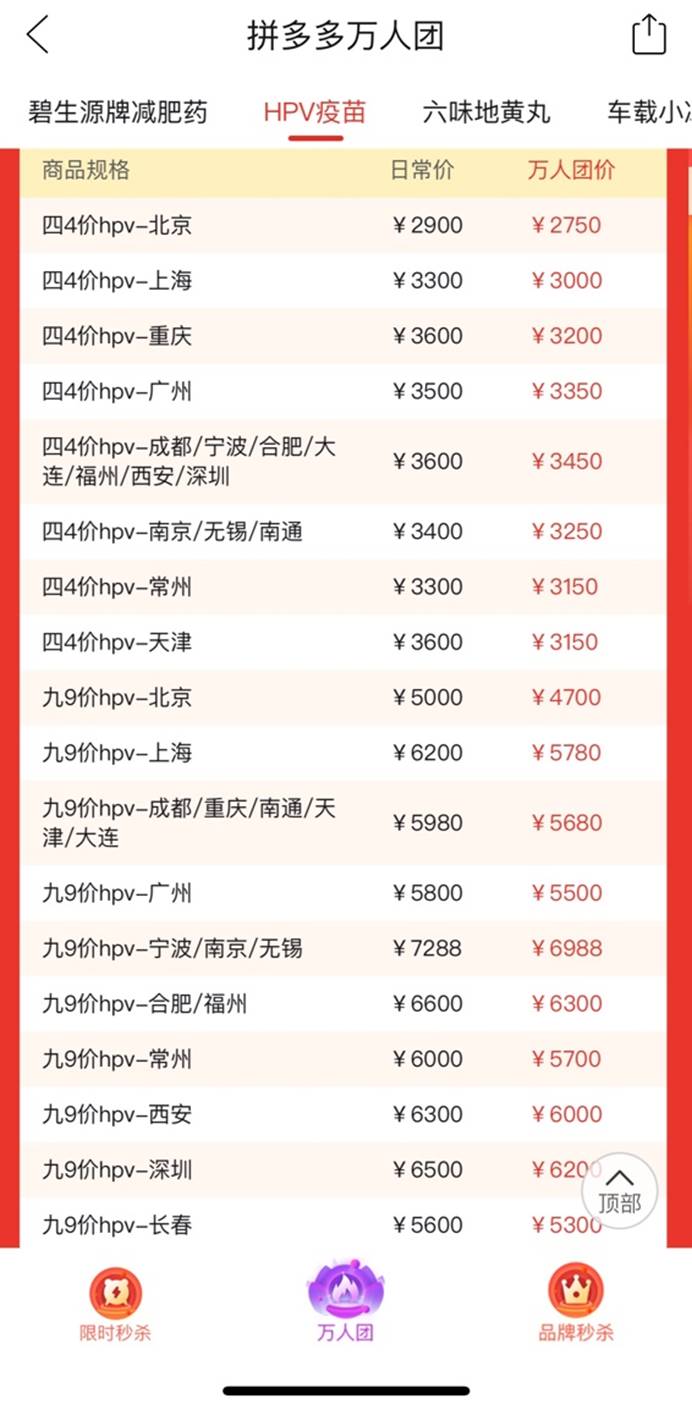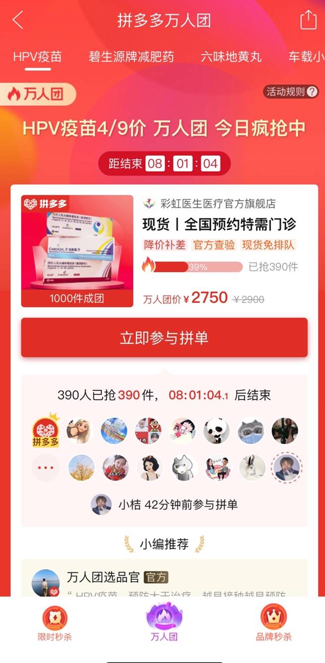 HPV現貨疫苗登陸拼多多“秒殺萬人團”,百億補貼擊穿線上線下底價