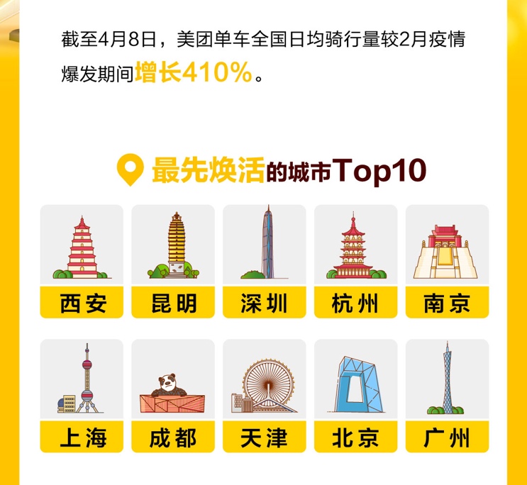 報(bào)告顯示,截至4月8日,美團(tuán)單車(chē)全國(guó)日均騎行量較2月疫情爆發(fā)期間增長(zhǎng)410%。煥活最快的城市前十位分別為西安、昆明、深圳、杭州、南京、上海、成都、天津、北京和廣州,其中,西安的美團(tuán)單車(chē)騎行數(shù)據(jù)在3月底便已完全恢復(fù)至疫情前水平,昆明、深圳、杭州也于4月8日前回歸正常。