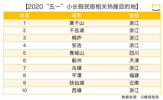 民宿是鄉村游體驗中不可缺少的部分。五一期間,馬蜂窩旅游平臺民宿預訂環比增長233.7%,浙江、江蘇、廣東等東南部城市預訂較為集中,莫干山、千島湖、桐廬、安吉、青城山等關鍵詞搜索熱度增幅顯著。圍繞民宿的熱搜詞,如網紅民宿、帳篷、農家樂、度假村、樹屋等,漲幅均在30%以上。