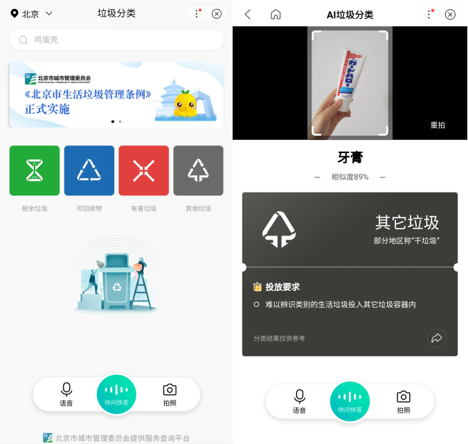 用戶只需要在百度App點擊底部話筒語音搜索“垃圾分類”即可進入小程序,體驗包括文字、語音、拍照搜索等全場景垃圾分類功能,及時獲取北京市政府關于垃圾分類的相關政策和垃圾分類指導。如果無法確定垃圾具體屬于哪個類別,還可以通過小程序下方的“語音”和“拍照”功能,用語音搜索或者視覺搜索來快速識別垃圾類別。