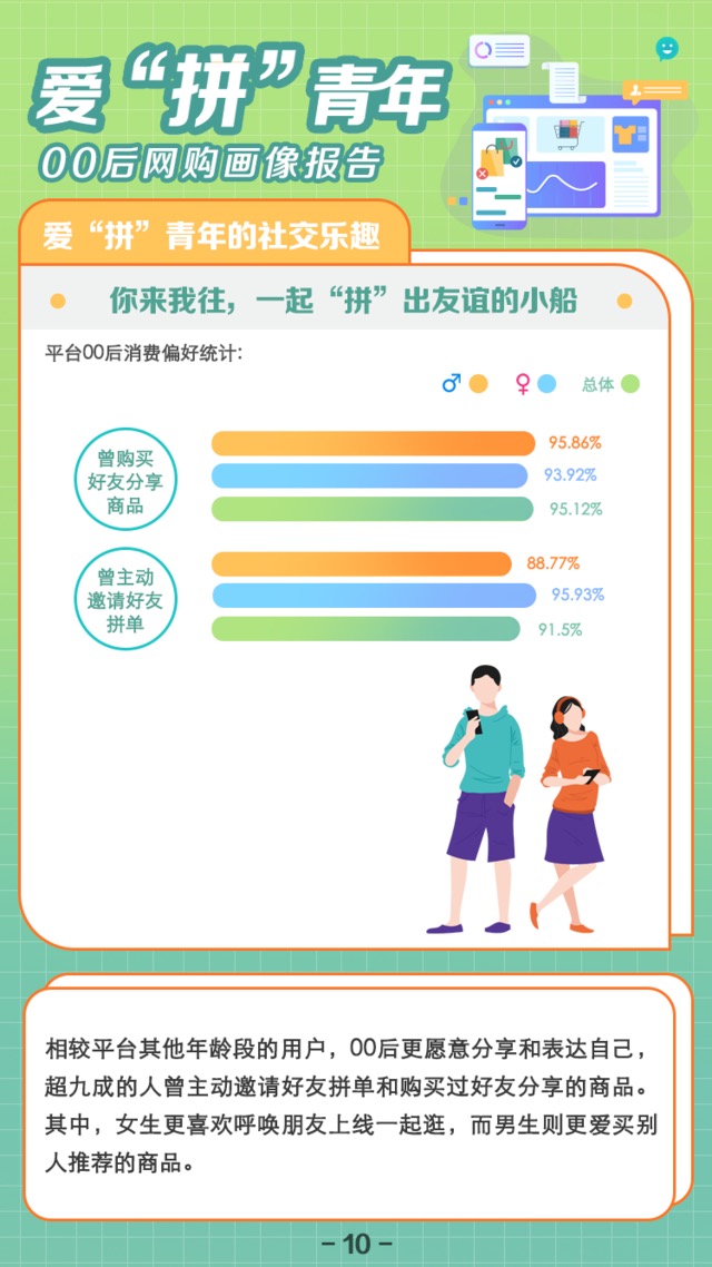 速途網(wǎng)5月2日消息(報(bào)道:李楠)五四青年節(jié)前,中國青年報(bào)·中青在線聯(lián)合拼多多發(fā)布的《愛“拼”青年:00后網(wǎng)購畫像報(bào)告》顯示,超過九成用戶網(wǎng)購時(shí)跟好友拼過單,除了追求購物性價(jià)比,00后青年注重購物的同時(shí),還享受社交的樂趣。
