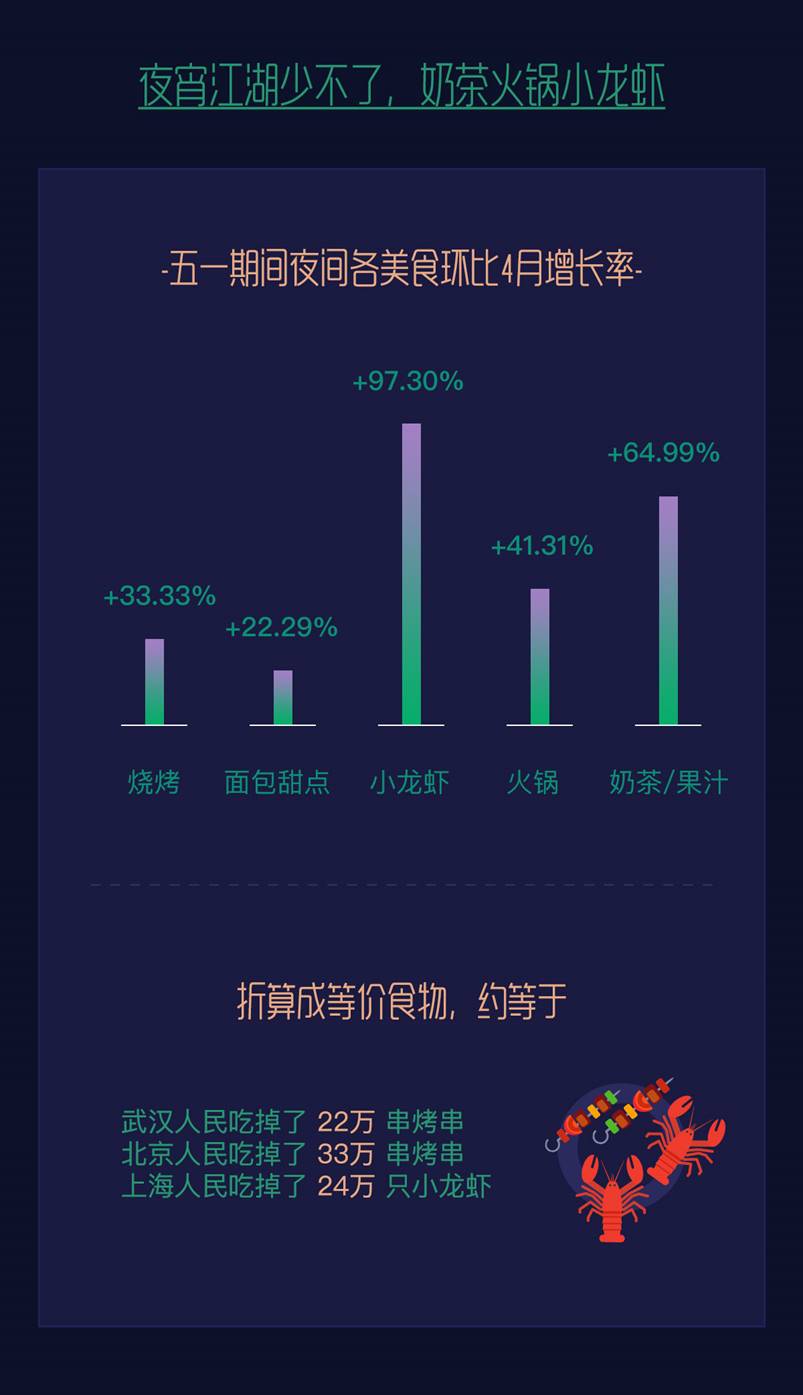 根據微信和美團聯合發布《“五一”夜經濟數據》,小長假期間,全國人民都在“報復性夜宵”。5月1日-3日晚上9點至次日2點,全國微信支付餐飲線下支付金額環比增長447%,武漢人民夜宵支付金額環比增長270%,其中烏魯木齊增幅最大,對比3月環比增長16倍。