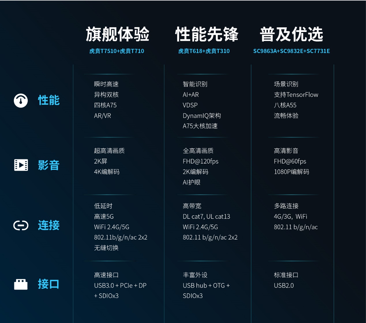 虎賁T7510 和虎賁T710致力打造旗艦體驗,充分利用虎賁7系列提供的高性能、低時延和無縫切換的連接能力,基于展銳影像引擎整體方案Vivimagic的4K編解碼技術,可提供更高畫質、更清晰細膩的影像細節,結合音頻處理技術,將帶來無比精彩的影音體驗。7系列提供了豐富的高速外設接口,多路數據并發Perfelink技術,提高數據的傳輸速率,為用戶帶來無感知的網絡切換。異構雙核架構NPU的采用,使AI算力大幅提升,為工業、商業、醫療、家居、教育等應用場景帶來智能化升級。