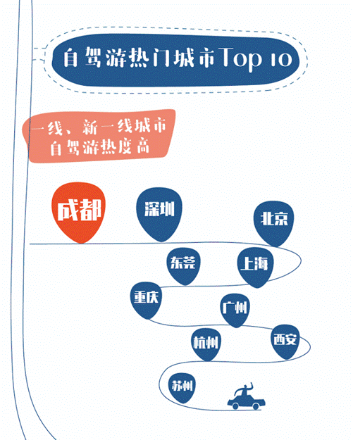 另外,全國自駕游熱度最高的10個城市集中在一線和新一線,其中8個均為南方城市,成都超過深圳、北京、上海,排名第一;東莞排名第五,自駕游熱度超過廣州;北方城市還有西安上榜,排名第八,重慶、杭州、蘇州亦榜上有名。