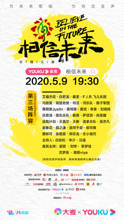 “相信未來”是由微博、網易云音樂、大麥、蝦米音樂、騰訊音樂娛樂集團等五大平臺共同發起,著名音樂人高曉松擔任總策劃的大型線上義演。以“對抗焦慮,回歸日?!睘橹骰{,節目形式不拘一格,流行、搖滾、民謠、古典等多種音樂形態多元呈現。