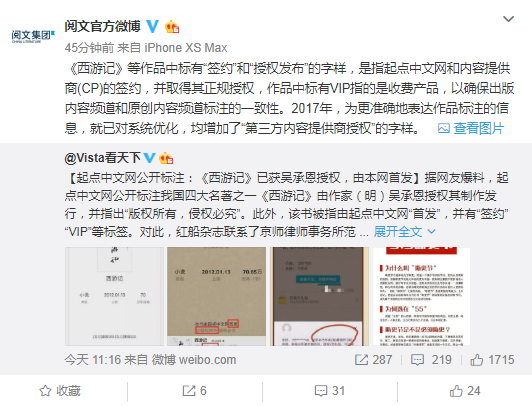 閱文方面稱,《西游記》等作品中標有“簽約”和“授權發布”的字樣,是指起點中文網和內容提供商(CP)的簽約,并取得其正規授權,作品中標有VIP指的是收費產品,以確保出版內容頻道和原創內容頻道標注的一致性。2017年,為更準確地表達作品標注的信息,就已對系統優化,均增加了“第三方內容提供商授權”的字樣。
