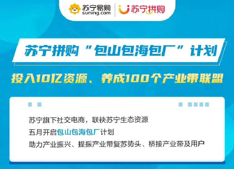 為了扶助產業帶商戶快速成長,蘇寧拼購發布了“包山包海包廠”賦能包,從物流、金融、營銷、直播、工具等多個角度扶助產業帶商戶。