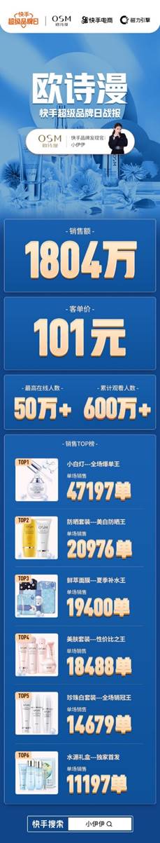 快手“超級品牌日”活動再創銷售佳績,在5月8日的快手“超級品牌日”歐詩漫專場中,快手頭部網紅主播“小伊伊”(快手ID:xiaoyiyi)專場帶貨歐詩漫品牌的多款美妝產品,最終當天直播帶貨總銷售額達到1804萬,平均客單價超過百元,直播最高在線人數超過50萬,累計觀看人數更是突破600萬。