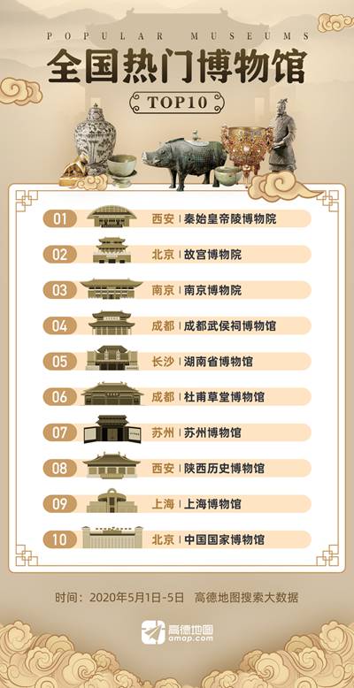 這份最新出爐的博物館榜單是基于疫情防控階段后首個(gè)五一小長(zhǎng)假的出行洞察。數(shù)據(jù)顯示,北京、西安、南京這三個(gè)有歷史記載的文化古都,均是文化之旅的熱門(mén)打卡地。在高德地圖覆蓋的全國(guó)近5000家博物館中,秦始皇帝陵博物院(秦始皇兵馬俑博物館)超過(guò)故宮,居全國(guó)十大熱門(mén)博物館首位,南京博物院位列榜單第三。