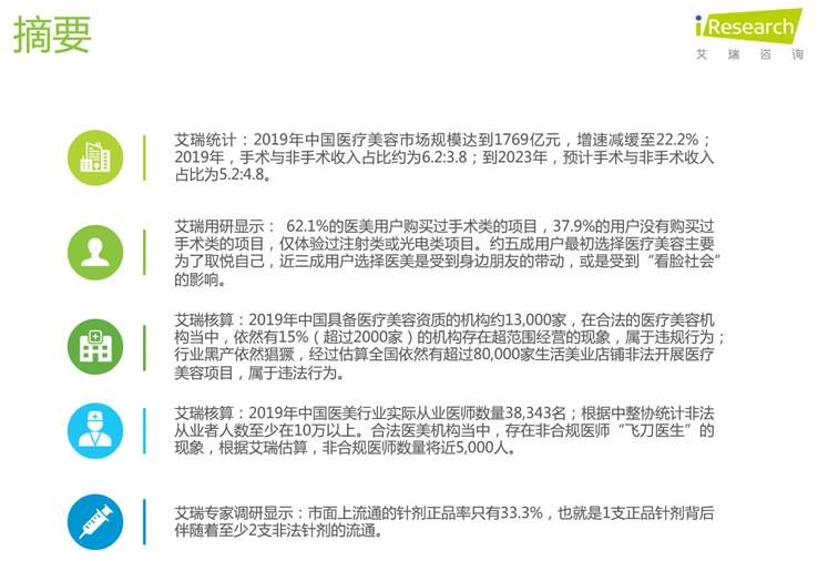 據艾瑞統計,在2019年1769億醫美市場規中,供給與需求不相適應的矛盾突出。在需求側,高需求消費者難以識別合法機構與醫生,潛在消費者對事故頻發的醫美持觀望狀態;在供給側,民營醫療美容機構因醫療、運營人才缺失,導致獲客難、客情難維系等問題。