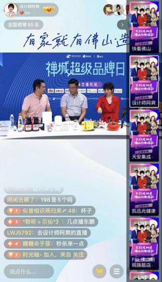 此次帶貨直播由禪城區(qū)政府、佛山傳媒集團聯(lián)合快手短視頻共同推出,快手商家號進行承接,天安新材、恒潔衛(wèi)浴、佛山照明、海天味業(yè)等佛山知名企業(yè)紛紛亮相。通過快手多鏈路直播技術,在“快看佛山”(ID:radiofoshan)、”天安集成“(ID:1925707868)等直播間同步直播,打造鏈接政府、企業(yè)、市民的線上超級消費互動平臺。
