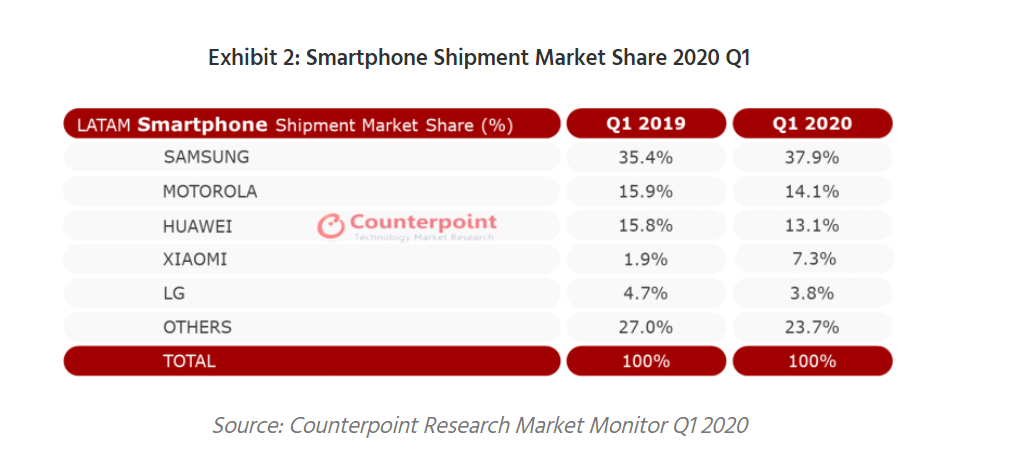 類似的情況也在拉丁美洲市場出現(xiàn)。2020Q1拉丁美洲智能手機(jī)市場同比下降20.8%,環(huán)比下降30.1%,小米成功躋身拉美市場前四,銷量同比增長2倍多,銷售份額由去年同期的1.9%提升至7.3%,反超出貨量持續(xù)下滑的LG,達(dá)到幾乎其兩倍的市場份額。