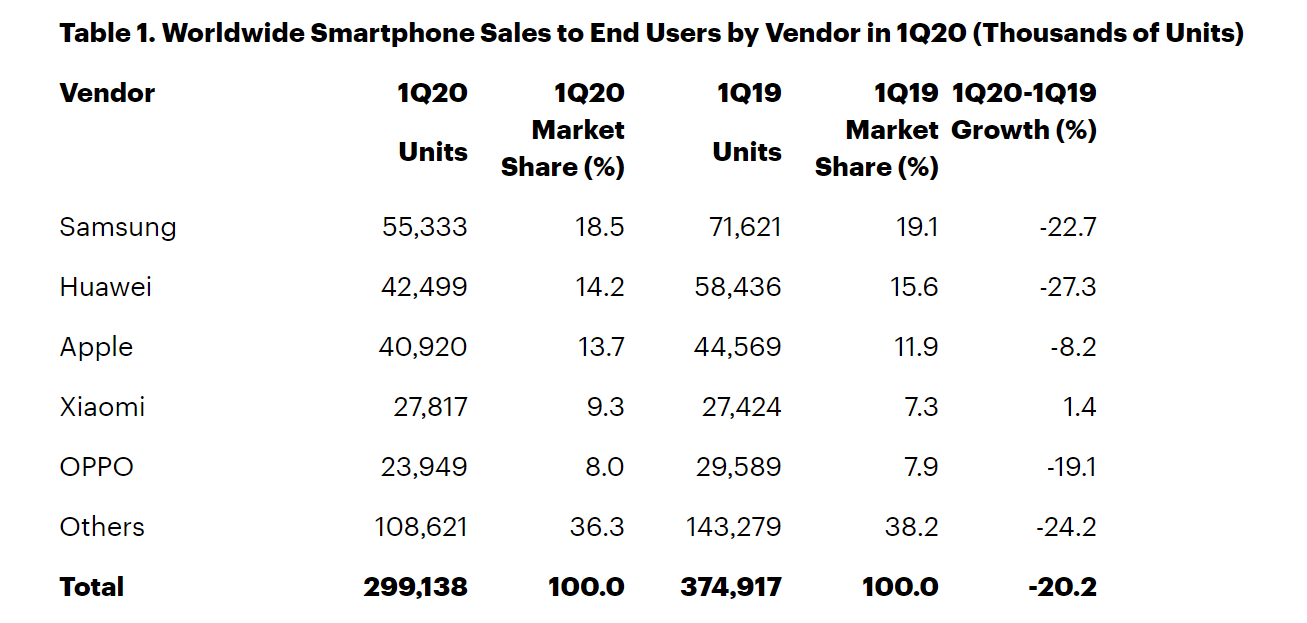 新冠疫情對手機(jī)行業(yè)造成了嚴(yán)重的沖擊,歐洲和拉美市場只是愈加惡劣的大環(huán)境縮影。根據(jù)Gartner的數(shù)據(jù),全球智能手機(jī)市場在2020年第一季度出現(xiàn)了有史以來最嚴(yán)重的下滑,終端用戶的銷量暴跌了20.2%。各大品牌均有較大幅度的下滑,小米是唯一一家銷量增長的智能手機(jī)廠商。