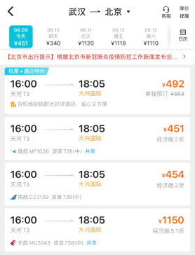 速途網(wǎng)6月9日消息(報道:吳佳馨)6月8日晚間,武漢交通運輸委員會發(fā)布消息稱,經(jīng)民航局批準(zhǔn),6月9日起,武漢天河機場至北京客運航線航班復(fù)航。通知發(fā)布后,截至6月9日10時,去哪兒網(wǎng)平臺上已有旅客預(yù)訂今日出發(fā)的北京-武漢航線機票,平均支付價格為457元,與去年同期相比下降45%。