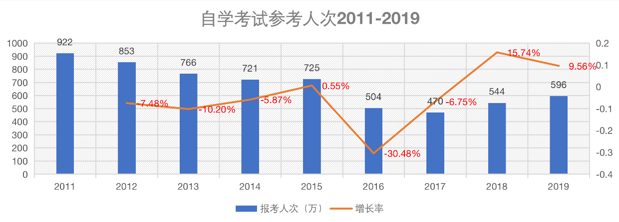 《公報(bào)》顯示,2019年,成人本專科招生人數(shù)第一次突破300萬(wàn);自考人數(shù)也繼2016年大幅下降后,進(jìn)一步回升,逼近600萬(wàn)參考人次。
