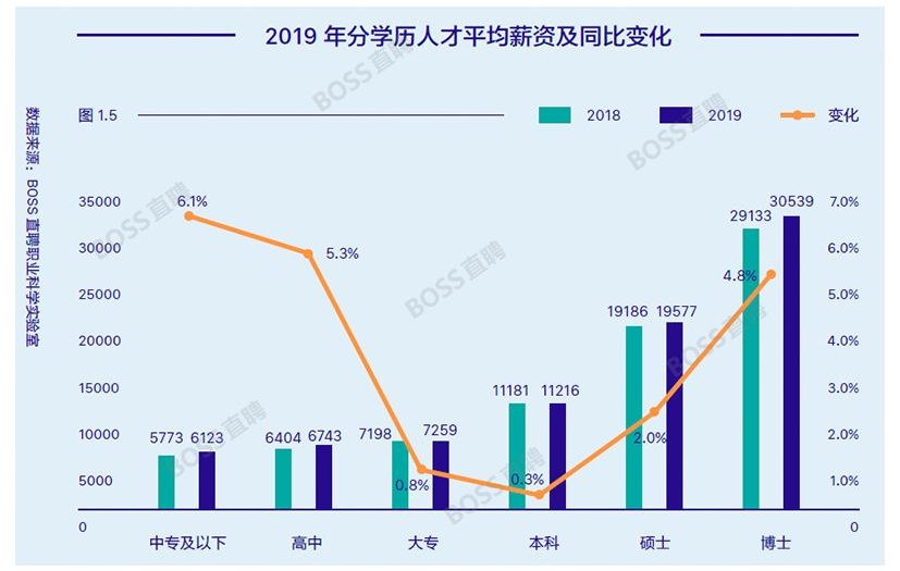 學(xué)歷提升關(guān)系到求職者在求職時(shí)的競(jìng)爭(zhēng)力,也關(guān)系到求職者的薪酬待遇。根據(jù)Boss直聘在2019年12月發(fā)布的《2020人力資本趨勢(shì)報(bào)告》顯示,本科學(xué)歷人才的平均薪資比高中畢業(yè)學(xué)歷人才高出近5000元,比大專學(xué)歷人才高出近4000元。而碩士學(xué)歷人才的平均薪資與本科及大專學(xué)歷人才的懸殊更大。