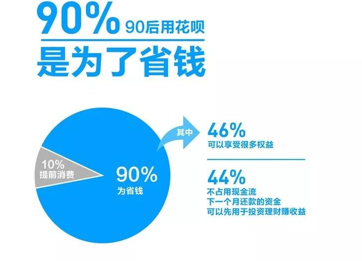 據《90后攢錢報告》調查,有90%的90后使用花唄是為了省錢,其中超過40%的人認為花唄能享受很多權益,還不用占現金流,可以先進行投資理財,例如存在余額寶等等。