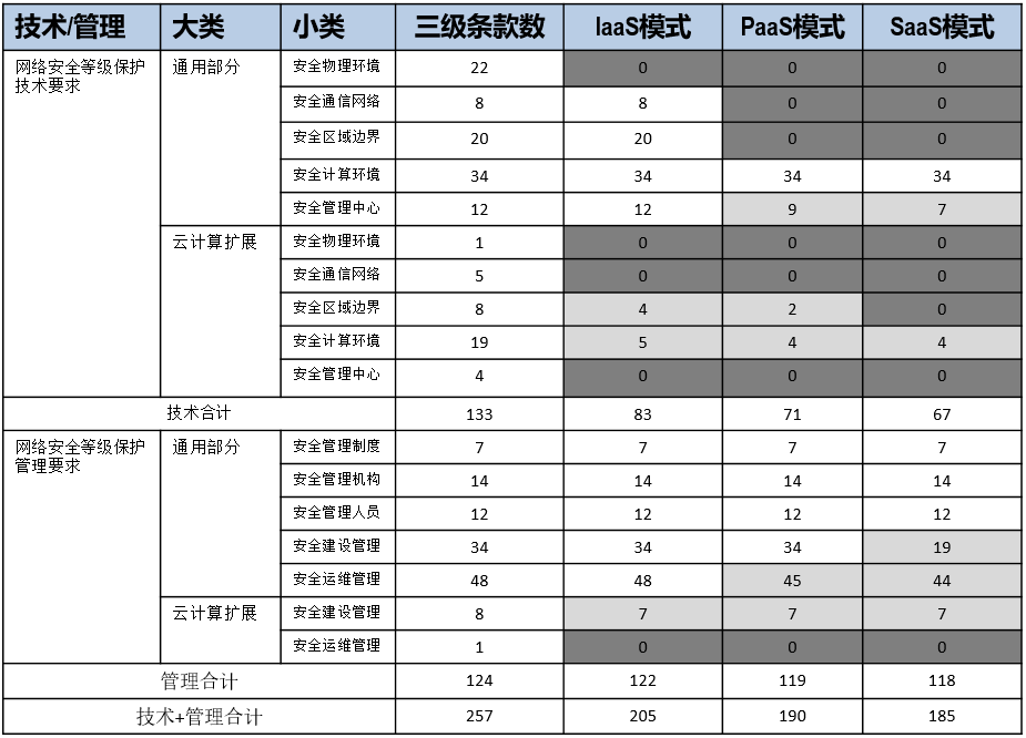 如上圖所示,以用戶最常過的等保3級為例,白皮書對用戶在云上過等保需要關(guān)注的條款項進行了詳細分類和解讀,在IaaS、PaaS、SaaS三種模式下用戶要關(guān)注的條款項依次減少:IaaS模式下,用戶主要關(guān)注物理環(huán)境以上的工作,需要關(guān)注的條款數(shù)是自建機房的80%;PaaS模式下,是自建的74%;SaaS模式下,是自建的72%。