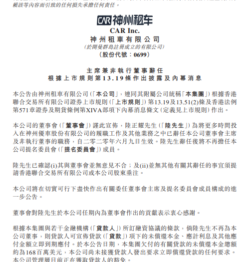 神州租車:陸正耀已辭任董事會主席及非執行董事職務 王輝 ? 2020年6月10日 09:15 ? 資訊 6月10日消息,神州租車發布公告稱,陸正耀先生為將更多時間投入在神州優車股份有限公司的履職工作及其他業務之中,已辭任本公司董事會主席及非執行董事的職務。 贊 (0) 王輝 0 生成海報 10國外交官組歐洲直播天團 “中東歐優品云上展”拼多多開幕 上一篇 2020年6月9日 21:47 沃爾沃“525車主服務節”,體驗更多貼心有愛的售后服務 下一篇 2020年6月10日 09:47