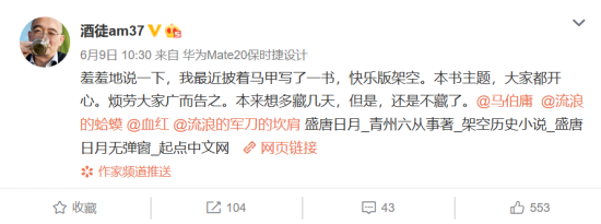 速途網6月11日消息(報道:吳佳馨)速途網獲悉,閱文集團公布新合同后,迎來大神作家回歸潮。6月9日,網絡文學作家酒徒在微博宣布將以新筆名“青州六從事”在起點中文網發布作品《盛唐日月》。