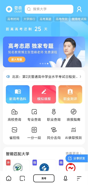 考得好,還要報的好!基于全面覆蓋各大正規高校、專業、歷年考分、錄取結果等大數據,夸克搜索應用人工智能技術,提供了模擬填志愿、AI錄取預測、智能匹配大學、職業性格測試,以及新高考選科等全流程的志愿填報AI工具。