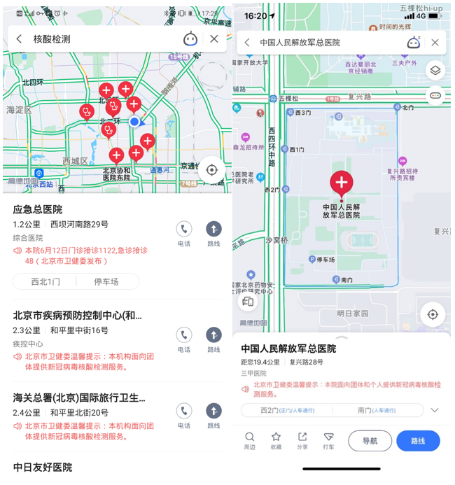高德地圖提醒廣大用戶,這98家核酸檢測機構有的面向個人,有的僅接待團體檢測,各家機構的預約服務方式不同,可通過官方電話、公眾號、114平臺或者京醫通等不同渠道提前預約。