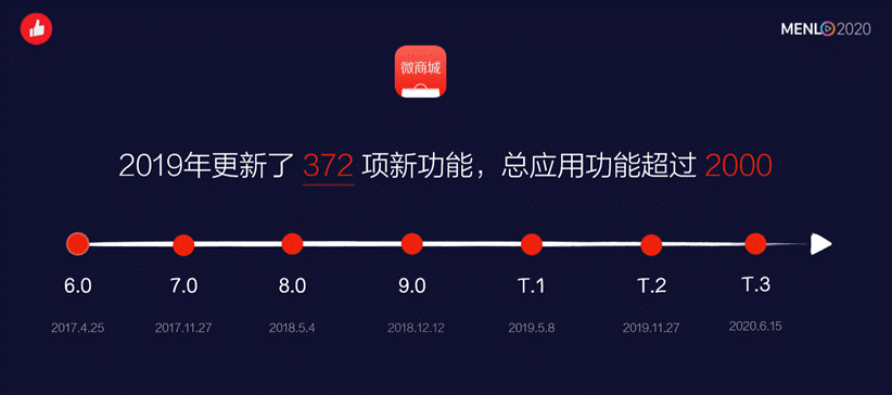 會上,有贊微商城正式發布了T.3版,截至目前累計功能已經超過2000項,其中包括社群接龍、品牌內購、新品發售、品牌官網等新功能。