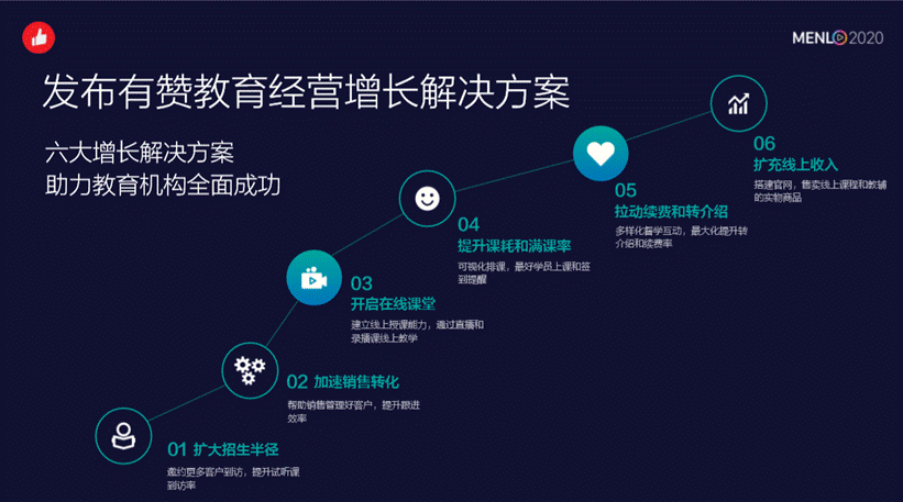 有贊已經發布了“有贊教育經營增長解決方案”,從擴大招生半徑、加速銷售轉化、開啟在線課堂、提升課耗和滿課率、拉動續費和轉介紹、擴充線上收入等6個環節助力教培機構經營增長,幫助教育機構快速構建線上經營能力。