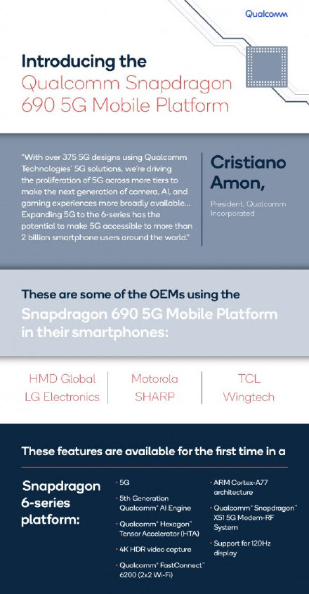 與驍龍675相比,驍龍690?CPU速度快20%,圖形性能快60%。另外,驍龍690還將在高通公司的FastConnect 6200系統(tǒng)上實(shí)現(xiàn)對(duì)Wi-Fi 6的支持,以及120Hz刷新率屏幕。HMD、LG、摩托羅拉、夏普、TCL和Wingtech都將推出搭載該芯片組的設(shè)備。