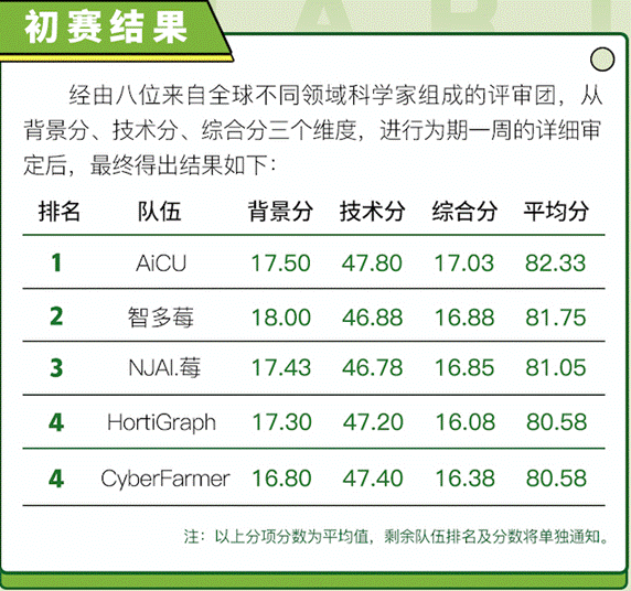 6月24日,經過為期一周的激烈角逐和專家評審后,第一屆“多多農研科技大賽”初賽結果出爐,在參與初賽的17支科技組隊伍中,共有4支年輕隊伍脫穎而出,分別是AiCU隊、智多莓隊、NJAI.莓隊、CyberFarmer·HortiGraph隊。