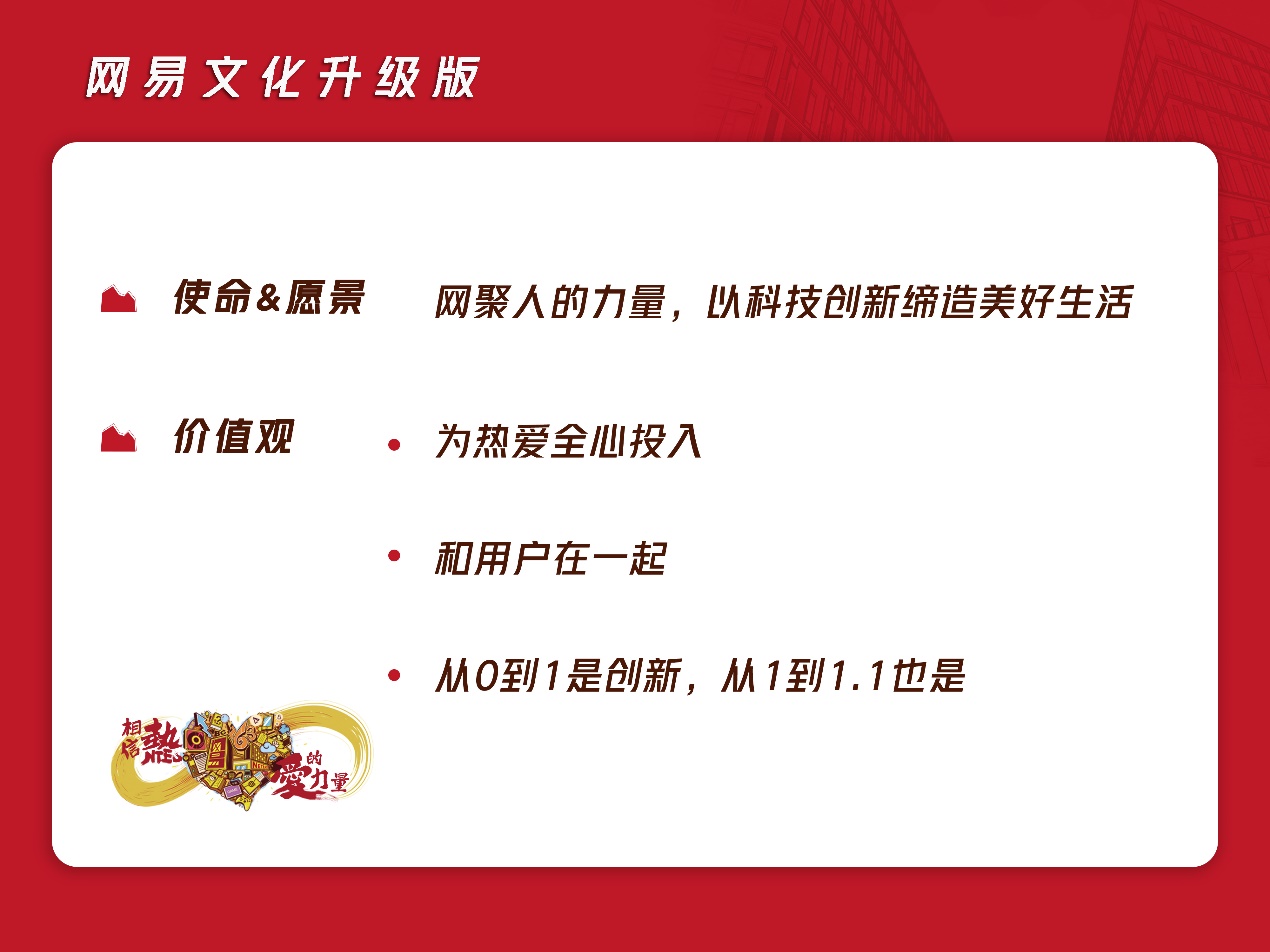 新版企業文化中,網易將以“網聚人的力量,以科技創新締造美好生活”為企業使命愿景;以“為熱愛全心投入”、“和用戶在一起”、“從0到1是創新,從1到1.1也是”為企業價值觀。
