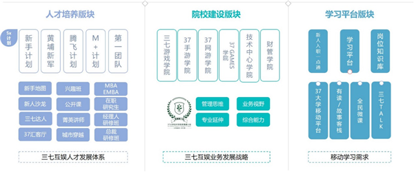 公司圍繞各事業(yè)群院校的業(yè)務(wù)及培訓(xùn)需求,還協(xié)助搭建三七游戲?qū)W院、37手游學(xué)院、37網(wǎng)游學(xué)院、37GAMES學(xué)院、技術(shù)中心學(xué)院、財(cái)管學(xué)院等在內(nèi)的院校體系,促進(jìn)各事業(yè)群文化傳承及專業(yè)能力成長(zhǎng)。