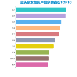 從區域分布來看,趣頭條的女性用戶遍布中國大地。其中,四川姐姐對趣頭條的熱愛位居第一,北京、上海等一線城市也不乏使用趣頭條的女性用戶。山東、河北、遼寧、河南、黑龍江等省份的女性用戶榜上有名,比起南方姐姐,北方姐姐們更青睞趣頭條。