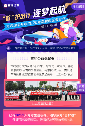 據(jù)了解,“首約公益”項(xiàng)目為長(zhǎng)期性公益項(xiàng)目,線上用戶通過(guò)點(diǎn)贊助力可累積首約公益里程,而每累積一定公里,首汽約車將免費(fèi)接送1位貧困考生參加高考。此外,首汽約車該公益模式還將持續(xù)深化發(fā)展,用戶累積的公里數(shù)均能轉(zhuǎn)化為公益能量,除用于愛(ài)心送考,還能用于更多的公益項(xiàng)目,有利于公益全民化、廣覆蓋。