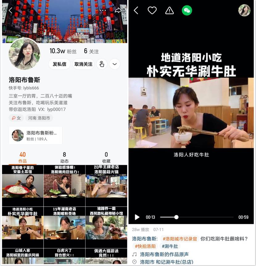 如果光看布魯斯的視頻還不過癮?再來“洛陽表妹”(快手ID:lybm8888)的賬號看看?自稱“全洛陽最愛吃”,無論是步行街的網紅店,還是巷子里的老字號,表妹通通來者不拒,酸甜苦辣咸,沒毒都能吃。怪不得有老鐵評價,“這妹子吃東西看著也太幸福了吧,再不開心看她的視頻心情都會變好。”