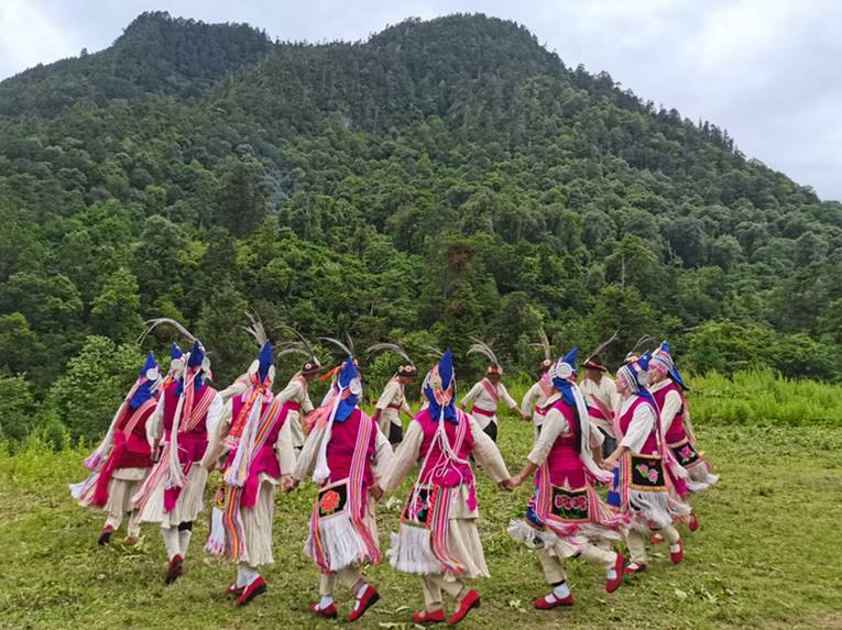 ▲當地景區正在為直播間的觀眾表演維西傈僳族民間舞蹈“阿尺木刮”。(陸辰曦 攝)