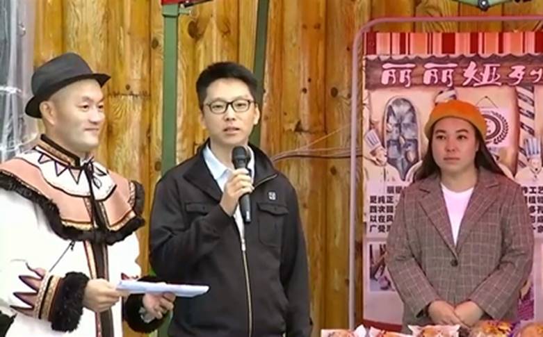 ▲額爾古納市副市長趙偉(中)正在介紹當(dāng)?shù)靥禺a(chǎn)——俄羅斯族“列巴”、草原牛肉干、蜂蜜、樺樹皮燙畫、皮雕包等美食產(chǎn)品和手工藝品。(涂昊攝)