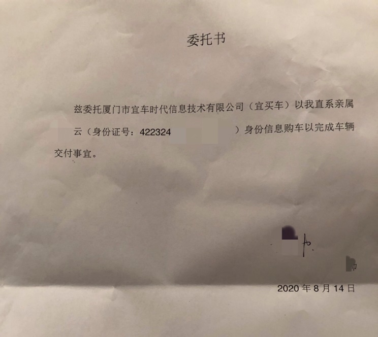 “車子是全新的,發票也是真的。”宜買車在回應中出示了車主委托書表明,系受車主委托,確認使用其直系親屬的身份信息繼續進行車輛交付。